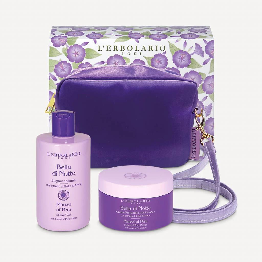 In questa raffinata pochette viola sono custoditi due cosmetici della linea Bella di Notte essenziali per la cura del corpo: il Bagnoschiuma e la Crema idratante profumata dalle note fiorite e vanigliate. Il kit è una perfetta idea regalo da donna, adatta a ogni occasione.